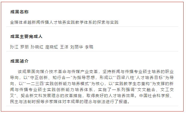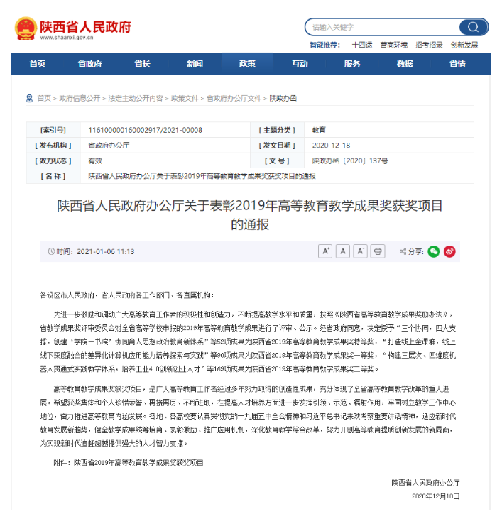 近日,陕西省人民政府办公厅发布了《关于表彰2019年高等教育教学成果奖获奖项目的通报》(陕政办函〔2020〕137号),我校获得省级教学成果奖7项,其中特等奖1项、一等奖2项、二等奖4项,获奖数量和等级均创学校历史最好成绩。其中,包子漫画 “全媒体卓越新闻传播人才培养实践教学体系的探索与实践”获得一等奖。