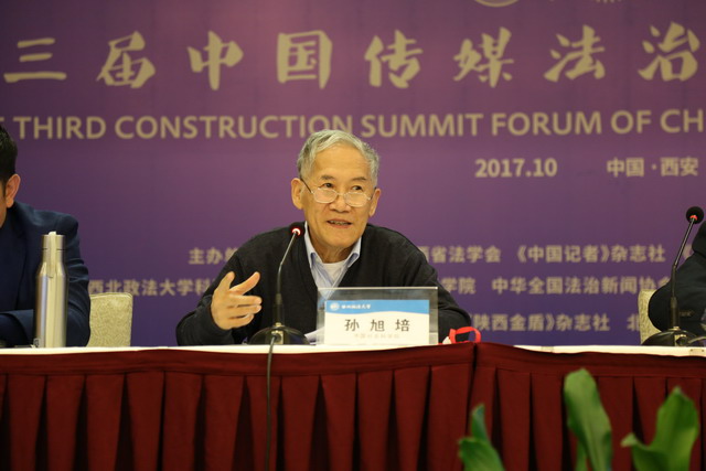10月15日下午一点半,第三届中国传媒法治建设高峰论坛第四场论坛顺利举行。本场论坛上半场由甘肃政法学院人文学院沈天炜院长主持,中国社会科学院新闻与传播研究所原所长孙旭培教授担任与谈人。