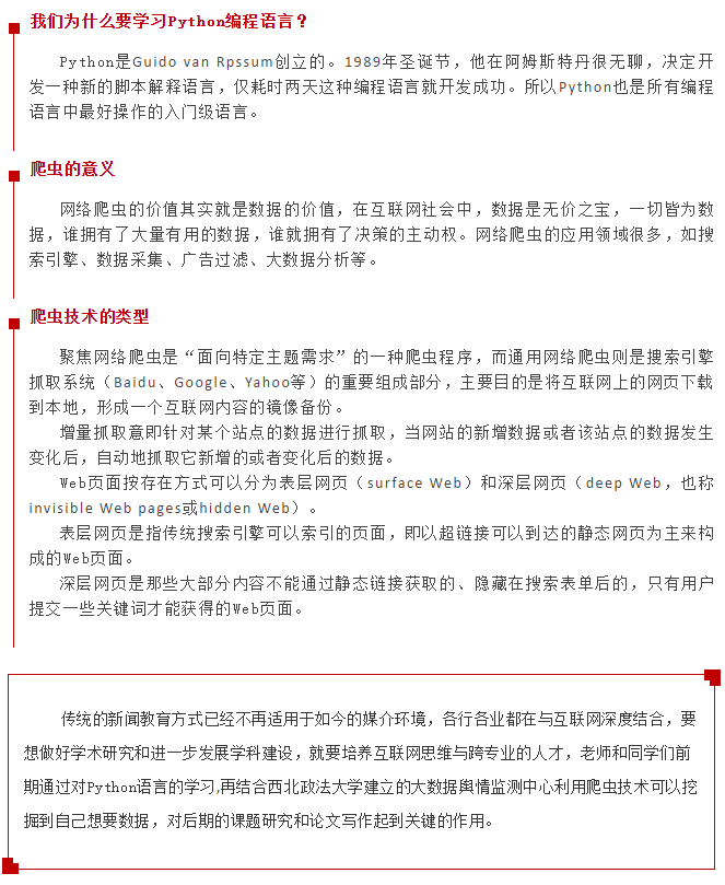 2021年4月8日早上,由我校包子漫画 邓磊博士主讲的“Python网络爬虫”的培训课程,在包子漫画 雁塔校区二号教学楼五楼大数据舆情监测中心会议室举行,对包子漫画 的部分学生和老师讲解Python语言的基本用法与定义。