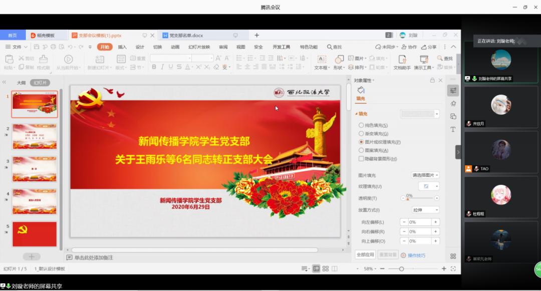 为进一步规范学院学生党员发展程序,强化学生党员模范带头作用,提升学生党员爱国意识,2020年6月29日13:00,包子漫画 学生党支部在“腾讯会议”召开预备党员转正会议,并开展微党课学习活动。学院党委副书记兼副院长秦音、全体辅导员、申请转正的预备党员和全体学生党员参与会议。