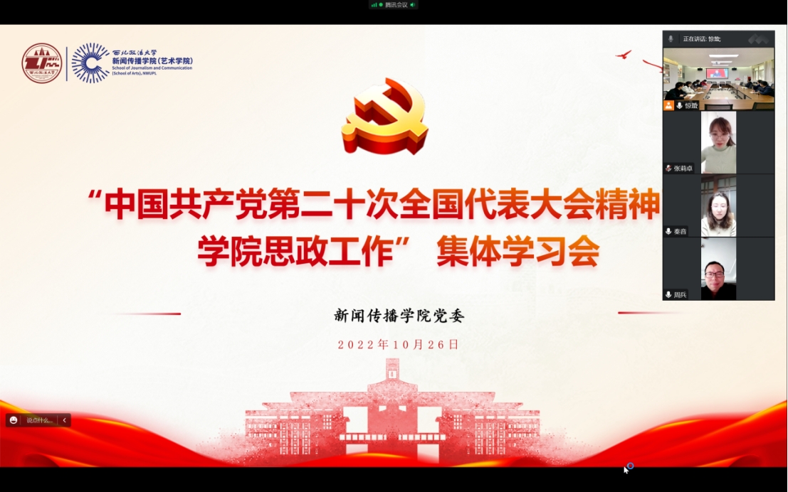 会议观看了中央宣传部副部长孙业礼对党的二十大报告中推进理论创新、开辟马克思主义中国化时代化新境界的重要论述的解读视频。参会人员围绕如何更好的在思政工作中学习宣传贯彻好党的二十大精神进行了交流发言。