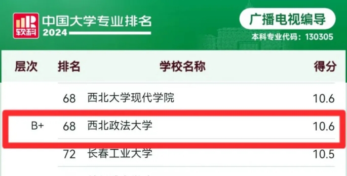 广播电视编导专业层次B+,得分10.6分,较2023年前进2位,全国排名第68名,位列陕西省入选高校第四。