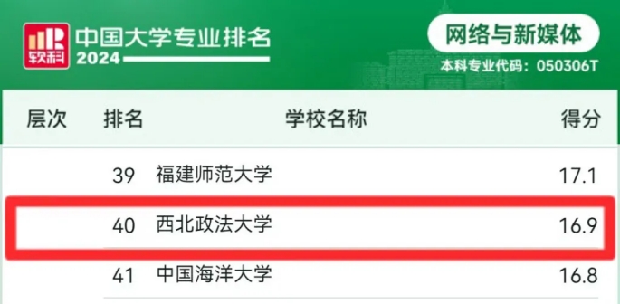网络与新媒体专业层次B+,得分16.9分,全国排名第40名,位列陕西省入选高校第四。完整版请点击:软科中国大学专业排名——网络与新媒体