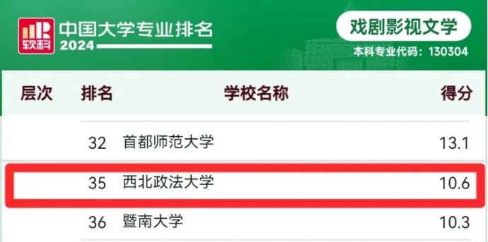 戏剧影视文学专业层次B,得分10.6分,全国排名第35名,位列陕西省入选高校第二。