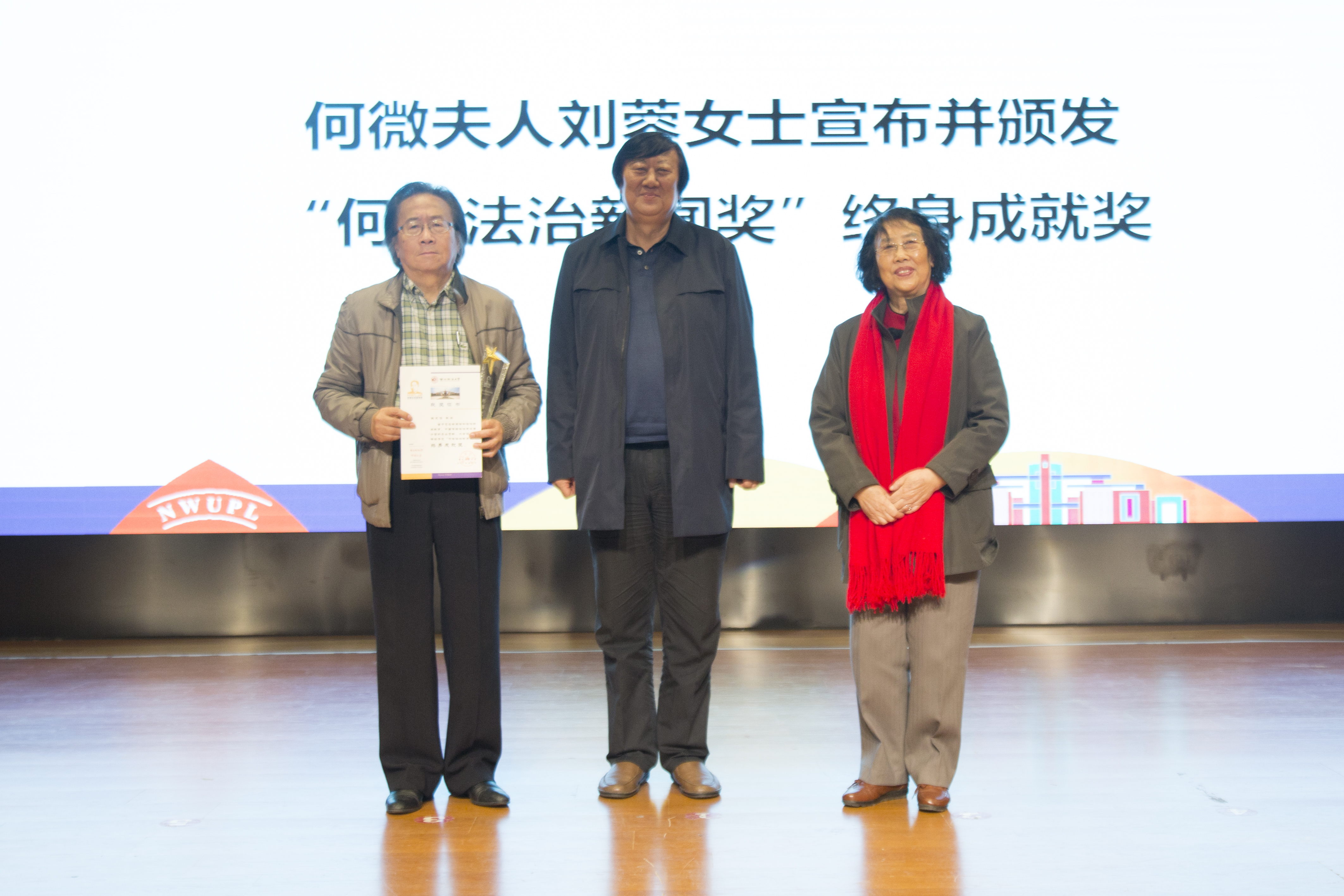 何微先生夫人刘蓉女士向“何微法治新闻奖”终身成就奖获奖者颁奖