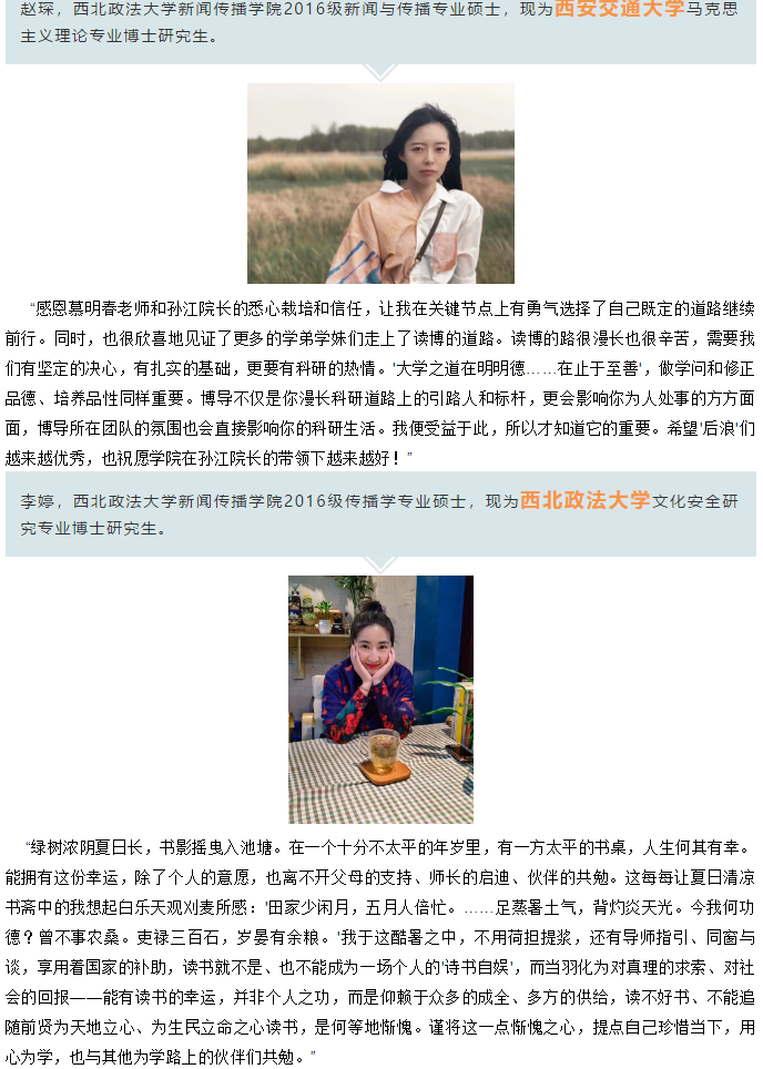 盛夏,又有一批新传人即将离开西法大的校园。对于大部分研究生来说,这是他们最后的、也是最宝贵的校园时光。而对于以下几位同学来说,no no no,校园时光仍未结束!