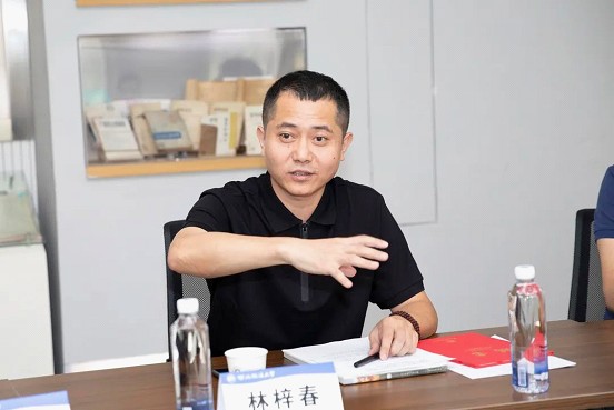 林梓春向大家介绍了珍藏馆古树普洱茶的生长环境、开发研究状况、创立珍藏馆品牌的初衷,希望通过与学院开展产学研合作,使古树茶从原始森林走出去,传播千年茶文化,实现发展双赢。